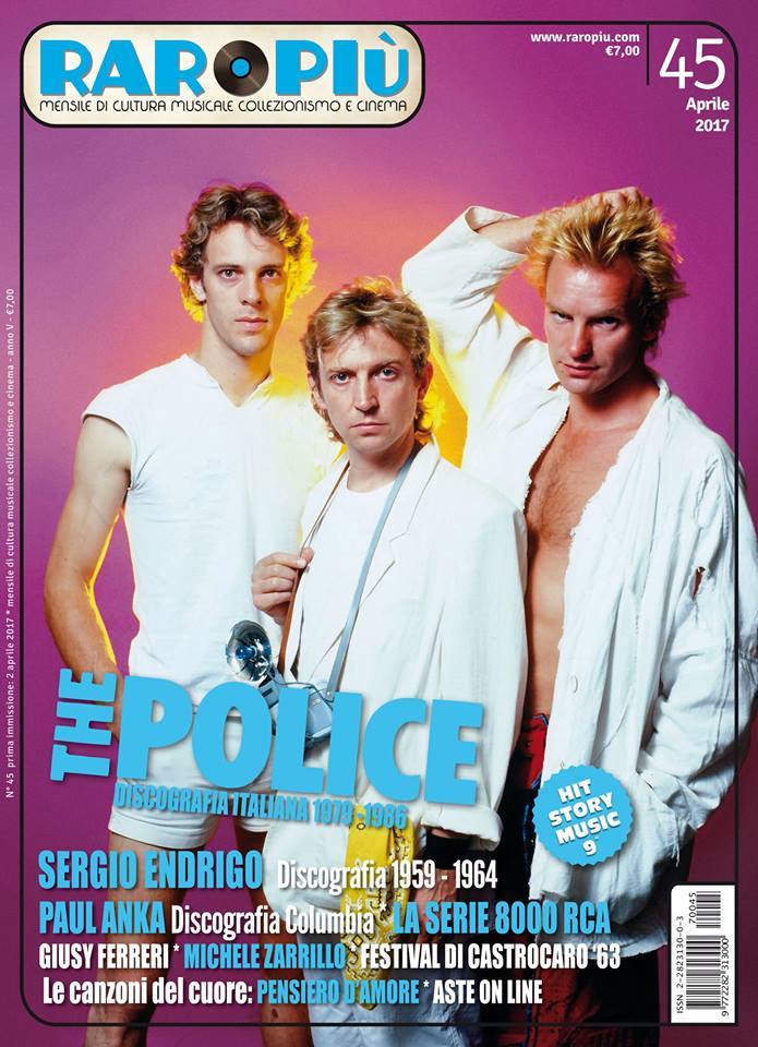 Occhio alle edicole, tra domani E dopodomani è in arrivo “Raropiù” di aprile ricordandoci della rock-reggae band Police, ma anche tant’altro, come la rara prima discografia di Sergio Endrigo, Paul Anka, Giusy Ferreri, Michele Zarrillo, la terza parte della serie 8000 della RCA, Castrocaro ’63 con la Cinquetti e Bruno Filippini, l’Aste dei rari dischi venduti, il nono fascicolo della storia delle classifiche di vendita dei 45 giri e molto altro. “Raropiù” in tutte le edicole d‘Italia (www.raropiu.com)