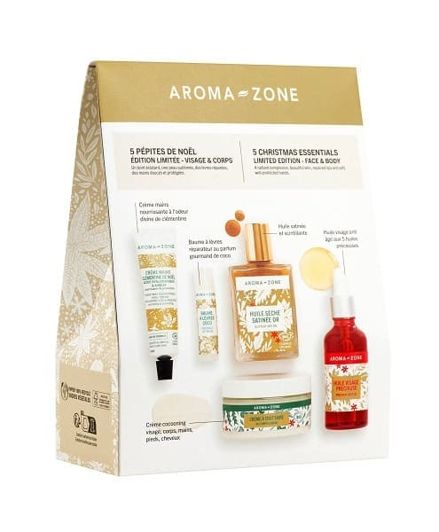 Per un incarnato radioso, una pelle purificata, labbra nutrite e mani morbide e protette Aroma-Zone ha pensato a un Cofanetto con 5 Prodotti di Natale.