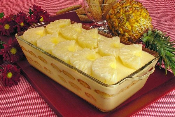 Prendete una pirofila e fate uno strato con i savoiardi imbevuti nel succo di ananas, poi fate uno strato con la crema al mascarpone e aggiungete un po’ di ananas a pezzettini. Proseguite così alternando savoiardi e crema al mascarpone.