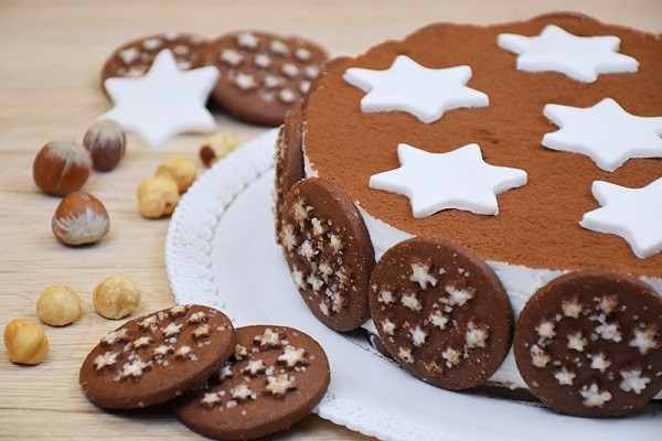 Riprendete la torta, spolverate la superficie con il cacao amaro e decoratela con stelle di pasta di zucchero, quindi attaccateci tutto intorno una fila di biscotti Pan di Stelle. Aiutatevi in questa operazione spalmando i biscotti da attaccare con un po’ di Nutella.
