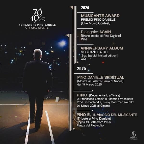 A marzo nel mese del 70° anniversario della sua nascita, uscirà al cinema il film-documentario ufficiale su tutta la vita di Pino Daniele intitolato “PINO”. Mentre il Palazzo Reale di Napoli ospiterà la mostra “Pino Daniele Spiritual”.