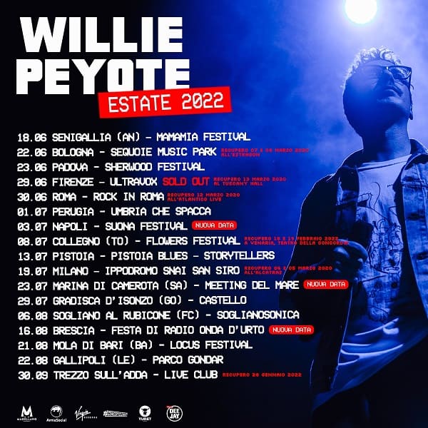 Gli appuntamenti si terranno all’interno di alcuni storici club italiani. Alcuni dei quali avrebbero dovuto ospitare durante l’inverno i concerti di Willie e della sua band. Una scelta dettata dalla voglia di supportare i club italiani che hanno fortemente sofferto durante questi due anni di pandemia.